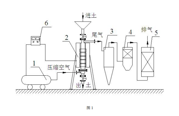 尾气处理系统由旋风除尘器 3、除湿器 4 和吸附塔 5 组成。旋风除尘器 3、除湿器 4 和吸附塔 5 均由碳钢材料制作。由立式解吸炉排出的尾气首先进入旋风除尘器 3,尾气中 的颗粒物在离心力的作用下与气流分离而被捕集下来 ;气流离开旋风除尘器 3 后进入除湿 器 4。除湿器 4 内装有规整填料,除湿器 4 的作用主要是去除空气及污染土壤因高温加热 挥发进入尾气中的水分,以保证后续尾气吸附处理的高效运行。除湿后的尾气流入吸附塔 5 中,吸附塔 5 内装有自行制备的高性能生物质环境吸附材料或活性炭,尾气中的挥发性 / 半挥发性有机物被吸附剂吸附,吸附处理后尾气可达标排放。处理系统。